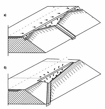 часть; 2 - прорези по Одной из разновидностей схемы 2 является система поверхностного водоотвода, применяемая на участках невысоких насыпей в Индии [4]. Эта система включает устройство цементобетонных берм, водосливов переменного сечения и открытых откосных лотков треугольного сечения (рис. 6, а). При этом откосы насыпи укрепляются засевом трав, а в нижнем бьефе откосных лотков устраивается бетонный зуб. На затяжных участках с постоянным продольным уклоном возможно устройство водослива с расширенным поперечным сечением и открытого лотка треугольного поперечного сечения, располагаемого на откосе под определенным углом (рис. 6, б).