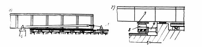 последующего блока устанавливать на 35. Конструкция и отметки оголовков опор должны предусматривать возможность установки домкратов, необходимых для снятия нагрузки с опор скольжения и установки опорных частей, а также выборки прогиба консоли надвигаемого пролетного строения. 36. Конструкция опор должна обеспечивать возможность и простоту устройства подвесных подмостей, необходимых для размещения рабочих, обслуживающих устройства скольжения. 37. Пролетные строения надвигают тихоходными электролебедками, ручными лебедками или гидродомкратами. Пятитонные лебедки с 6 - 8-кратным полиспастом рекомендуется применять при расчетном усилии надвижки до 20 - 30 тс. Для упрощения работ по запасовкам полиспаста лебедки располагают стационарно на сборочном плазу (рис. 7, а). При усилии надвижки до 50 - 100 тс надвижку рекомендуется выполнять с помощью челночного устройства, которое располагают на устое или на промежуточной опоре. Толкающее усилие при этом передается балке снизу или сбоку (рис. 7, б, в). Для возвратно-поступательного перемещения в челночном устройстве рекомендуется применять домкраты тройного действия конструкции Союздорнии - Главстроймеханизации мощностью 230 - 350 тс. Эти же домкраты следует применять при перемещении балок упором в торец с использованием прядей, заанкеренных в устой или сборочный плаз (рис. 7, г)*. * Ввиду большой трудоемкости не рекомендуется выполнять надвижку балок в торец с использованием вставок. При использовании для перемещения балок лебедок или челночно работающих устройств рекомендуется балки перемещать вниз по уклону. Для увеличения коэффициента трения на плоскости элемента челночного устройства скольжения, контактирующегося с фрикционной резиновой прокладкой, устанавливают стальной лист с поверхностью, обработанной грубым наждаком в направлении, перпендикулярном оси надвижки.