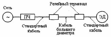 Рис. 13 Вариант схемы для уменьшения величины падения напряжения на линии преобразователь частоты - электродвигатель ПЧ - преобразователь частоты, ЭД - электродвигатель Кабель двигателя должен быть как можно короче, чтобы исключить электромагнитную эмиссию, а также уменьшить емкостной ток. Изменения напряжения на выходе преобразователя частоты вызывают емкостной ток через паразитные емкости кабеля двигателя. Рекомендуется, чтобы длина кабеля двигателя не превышала 300 м. При параллельно подключенных электродвигателях длины отдельных кабелей суммируются. Преобразователи частоты, инверторы которых выполнены на биполярных транзисторах с изолированным затвором (IGBT), имеют амплитуды импульсов выходного напряжения, независимо от выходной частоты, приблизительно в 1,5 раза превышающие напряжение сети с очень коротким временем нарастания. Напряжение на зажимах двигателя, в зависимости от свойств его кабеля, может почти удваиваться. Фильтры типа dU/dt подавляют пики выходного напряжения преобразователя частоты и быстрые изменения напряжения, которые пагубно действуют на изоляцию электродвигателя. Кроме того, фильтры dU/dt уменьшают высокочастотное излучение кабеля электродвигателя, высокочастотные потери и токи в подшипниках электродвигателя, а также они используются с двигателями, у которых величина диэлектрического сопротивления изоляции неизвестна или недостаточна. Необходимость применения фильтра dU/dt определяется изоляцией электродвигателя. На рис. 14 представлены зависимости линейного пикового напряжения на зажимах двигателя (ULL) и времени нарастания (Dt) от длины кабеля при отсутствии и при наличии фильтра dU/dt.