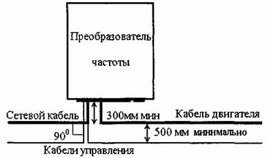 Кабели управления и другие контрольные кабели должны прокладываться как можно дальше от кабеля двигателя. Минимальное расстояние между параллельными участками кабеля двигателя и кабелей управления равно 500 мм. Однако экранированные кабели двигателей нескольких преобразователей частоты можно монтировать рядом при условии, что они достаточно удалены от всех других кабелей. Пересечение кабелей управления и кабелей питания выполняется под углом как можно более близком к 90°. Кабели сети, двигателя и управления должны выводиться из корпуса преобразователя частоты прямо и вниз на расстояние не менее 300 мм от его края для обеспечения удобств при техническом обслуживании. Прочие требования по монтажу должны быть выполнены в соответствии с ПУЭ и СНиП.