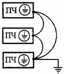 где IУЗО - ток настройки срабатывания УЗО, mA; N - число преобразователей частоты; ICRэд - емкостной ток электродвигателя, mA; ICRк - емкостной ток кабеля, mA. Заземление Нормативы электромагнитной совместимости требуют выполнения высокочастотного заземления экранов кабелей сети и электродвигателя со стороны преобразователя, а для кабеля двигателя необходимо еще заземление экрана со стороны электродвигателя. В случае использования нескольких преобразователей частоты их заземляющие проводники не должны образовывать петлю. Схема заземления показана на рис. 16.