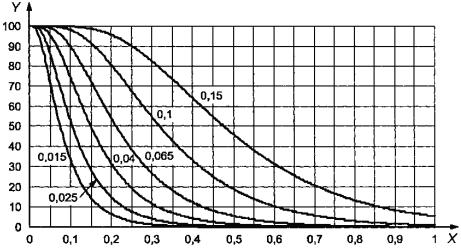 X - предельное качество, т.е. уровень качества с 10 %-ной вероятностью приемки (в процентах несоответствующих единиц продукции); Y - уровень качества с 95 %-ной вероятностью приемки (в процентах несоответствующих единиц продукции). Коды объема выборки показаны полужирным шрифтом. 24. Графики В - R (рисунки 5 - 19). Кривые и таблицы значений оперативных характеристик для кодов объема выборки В - R. «s» метод24.1. График В