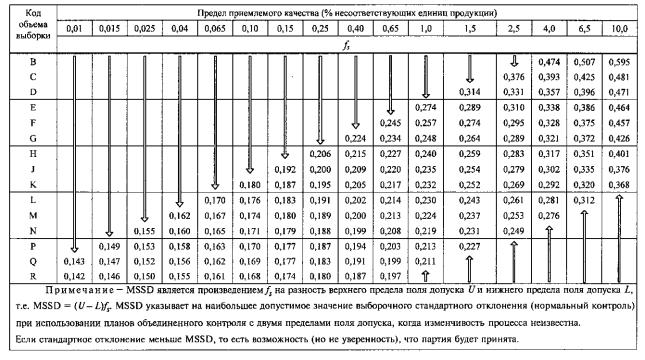 и Пример - Минимальная температура функционирования устройства равна 60°С, а максимальная температура равна 70°С. Продукцию контролируют партиями по 96 единиц продукции. Используют уровень контроля II, нормальный контроль с AQL = 1,5 %. По таблице А.1 (приложение А) кодом объема выборки является F. По таблице А.2 объем выборки равен 13. В соответствии с таблицей D.1 (приложение D), значение fs для MSSD при нормальном контроле равно 0,274. Полученные результаты измерений составили: 65,5°С; 60,0°С; 65,2°С; 61,7°С; 69,0°С; 67,1°С; 60,0°С; 66,4°С; 62,8°С; 68,0°С; 63,4°С; 60,7°С; 65,8°С. Необходимо принять решение о приемке или отклонении партии.