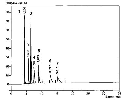 1 - циклогексан; 2 - фенилдодекан; 3 - 1,2-диметилбензол; 4 - гексаметилбензол; 5 - нафталин; 6 - дибензотиофен; 7 - 9-метилантрацен Рисунок 2 - Хроматограмма стандартного раствора 1 (СКС1) для калибровки системы 8.8 Измеряют значения времени удерживания пиков циклогексана, фенилдодекана, 1,2-диметилбензола, гексаметилбензола, дибензотиофена и 9-метилантрацена, используя систему сбора данных. 8.9 Убеждаются в том, что разрешающая способность между циклогексаном и 1,2-диметилбензо-лом находится в пределах 5,7-10 (11.2). 8.10 Рассчитывают отрезки времени с использованием формул, приведенных в 11.3. 8.11 Следят за тем, чтобы раствор СКС2 был гомогенным (8.4), затем вводят 10 мкл СКС2 и проверяют, как элюирует пик хризена - перед первым пиком FAME или вместе с ним. Обеспечивают, чтобы пик, соответствующий времени удерживания хризена, был выше, чем пик, соответствующий времени удерживания 9-метилантрацена. Примечание - Перед проведением испытаний на новой колонке, после периода кондиционирования или перед анализом образцов с FAME испытывают колонку с СКС2 для проверки ее работоспособности. 9 Калибровка9.1 Готовят четыре калибровочных раствора А, В, С и D с приблизительной (но точно известной) концентрацией, указанной в таблице 1, для чего в мерные колбы с точностью 0,0001 г взвешивают соответствующие соединения и доводят до метки гептаном (5.2). Примечание - Калибровочные растворы сохраняют свойства не менее 6 мес. при хранении в тщательно укупоренных контейнерах (например в мерных колбах вместимостью 100 см3) на холоде в защищенном от света месте (например, в холодильнике). Таблица 1 - Концентрации компонентов калибровочных растворов
