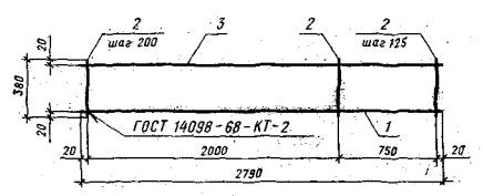 Черт. 3 3.4. Схему армирования железобетонного элемента сборной конструкции выполняют в соответствии с требованиями разд. 4. 3.5. На каждый железобетонный элемент сборной конструкции составляют ведомость расхода стали в соответствии с требованиями разд. 5. 4. СХЕМЫ АРМИРОВАНИЯ4.1. Схемы армирования выполняют в масштабах 1 : 20, 1 : 50 или 1 : 100. 4.2. На схемах армирования (черт. 4) указывают: контуры монолитной конструкции или элемента сборной конструкции и размеры, определяющие проектное положение арматурных изделий; арматурные изделия в соответствии с ГОСТ 21.107-78; закладные изделия, привариваемые к арматурному изделию при его изготовлении (не указывая их марки и установочные размеры); толщину защитного слоя бетона от внешней поверхности стержня до ближайшей грани элемента; фиксаторы (при необходимости) для обеспечения проектного ' положения арматуры.