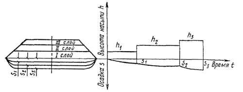 где H - полная толщина сжимаемого слоя; tтр - требуемый срок достижения осадки допускаемой интенсивности; tрасч - расчетный срок достижения полной осадки без замены слабого грунта (см. прил. 3 и 7). Предварительное осушение слабой толщи 5.33. Существенное улучшение свойств водонасыщенных органических грунтов, в том числе сокращение величины и длительности осадки, повышение несущей способности и проходимости в период строительства достигаются предпостроечным осушением открытыми канавами. Обязательным условием эффективности осушения является достаточное время действия и обеспечение непрерывного стока воды из канавы. Как правило, сооружения для предпостроечного осушения дорожной полосы в период эксплуатации дороги должны служить водоотводными сооружениями. Осушение дорожной полосы следует выполнять не позднее, чем за год до строительства дорожной одежды (при стадийном строительстве земляное полотно можно устраивать одновременно с осушением). При необходимости повышения проходимости болотных залежей в зоне производства работ их осушение выполняют за 1 - 2 года до начала строительства. 5.34. Осушительные канавы устраивают симметрично по обеим сторонам земляного полотна на расстоянии 2 - 3 м от подошвы насыпи с максимально возможной по условиям стока и производства работ глубиной. Продольный уклон по дну осушительных канав должен быть не менее 5 ‰ (в начальных участках длиной до 200 м - 3 ‰). Крутизна откосов осушительных канав составляет от 1:0,25 для малоразложившихся торфов до 1:1 - для слабых органо-минеральных и минеральных грунтов. Метод предварительной консолидации 5.35. Наиболее простым и достаточно эффективным методом повышения устойчивости насыпи на слабом основании является метод постепенного загружения (предварительной консолидации). Постепенное загружение применяется на основаниях II типа, а также на основаниях I типа при использовании временной пригрузки в случаях, когда устойчивость слабой толщи в природном состоянии недостаточна для восприятия прикладываемой нагрузки. Принцип метода постепенного загружения заключается в назначении определенного режима возведения насыпи, соответствующего повышения прочности грунта слабого слоя при уплотнении его давлением насыпи. Требуемый режим возведения насыпи определяется исходя из условия pфакт < pбез, которое должно соблюдаться в любой момент сооружения насыпи. Схема метода предварительной консолидации показана на рис. 19. Существенное значение в данном случае имеет упрочняемость слабого грунта при уплотнении; применение метода постепенного загружения будет тем эффективнее, чем интенсивнее упрочняется слабый грунт. В этом отношении наиболее благоприятными являются торфяные грунты. Грунты типа иольдиевых глин упрочняются мало, в связи с чем применение рассматриваемого метода при таких грунтах оказывается малооправданным. Рис. 19. Схема возведения насыпи методом постепенного загружения (предварительной консолидации) 5.36. Расчет режима постепенного загружения производят на основе учета взаимосвязи показателей влажности, прочности и осадки слабой толщи. При этом расчетную влажность толщи, соответствующую той или иной величине осадки St, устанавливают по формуле