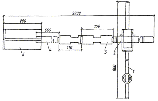По результатам испытаний строят график изменения по глубине усилия зондирования, удельного сопротивления зондированию (рис. 2). Рис. 2. Пример обработки результатов статического зондирования болотных грунтов а - график; б - эпюра (цифры - слои и прослойки); в - геологический разрез; 1 - древесно-осоковый торф; 2 - тростниковый торф; 3 - сапропель; 4 - мергель; 5 - мелкий песок. Испытание грунтов на сдвиг в условиях природного залегания приборами лопастного типа Испытание заключается в измерении максимального крутящего момента, возникающего при срезе грунта во время вращения в нем крестообразной лопасти. Для массовых испытаний при зондировании торфяных залежей, пластов сапропелей и илов рекомендуется использовать прибор сдвигомер-крыльчатку конструкции Калининского политехнического института СК-8 или сдвигомер-крыльчатку БЕЛДОРНИИ. Методика испытаний грунтов сдвигомером-крыльчаткой СК-8 (рис. 3) заключается в следующем. Измерительная головка надевается на переходник, в отверстие переходника и упора завинчивается стопорный винт. Затем при помощи рукояток крыльчатка задавливается в грунт до полной ее высоты. Перед поворотом проверяется положение стрелки индикатора и циферблат устанавливается на нуль. После указанных операций и проверки вертикального положения штанги обеими руками осуществляется поворот измерительной головки по часовой стрелке. По мере роста угла поворота отклонение стрелки индикатора возрастает. В процессе поворота следят за стрелкой индикатора до тех пор, пока не прекратится ее отклонение и не начнется спад. Положение стрелки, соответствующее началу ее обратного движения, представляет собой искомое значение. Эта величина записывается в журнал. Обычно разрушение грунта происходит при углах поворота от 20 до 60°. Рис. 3. Конструкция сдвигомера СК-8 1 - крыльчатка; 2 - устройство для учета трения штанг; 3 - 4 - штанги, соединенные резьбовыми переходниками; 5 - измерительная головка с рукояткой; 6 - индикатор часового типа Влияние трения по штангам учитывается следующим образом. После задавливания крыльчатки до заданной глубины прибор слегка поднимают (на 10 - 15 мм) при помощи ручек. При этом лопасти отключаются от штанг. Далее осуществляется поворот штанг с фиксацией по индикатору усилия, идущего на преодоление трения штанг о грунт. После этого штанги опускаются и приводятся в зацепление с крыльчаткой. Далее осуществляется поворот с включенной крыльчаткой. По окончании испытания прибор извлекается из грунта. Для отвинчивания штанг можно пользоваться стопорным винтом. При задавливании и извлечении прибора необходимо следить за тем, чтобы движение штанг осуществлялось по вертикали. Если при задавливании и повороте крыльчатки встречаются пни или камни, то необходимо извлечь прибор из грунта и попытаться задавить прибор в другом месте. Крыльчатки имеют следующие размеры: H = 100, D1 = 54 и D2 = 75 мм. Сдвигомер-крыльчатка БЕЛДОРНИИ (рис. 4) состоит из трех основных узлов: рабочего наконечника (крыльчатки), комплекта штанг и динамометрического устройства. Рис. 4. Лопастной прибор БЕЛДОРНИИ для определения сопротивления сдвигу торфяных грунтов 1 - рукоятка; 2 - верхняя штанга; 3 - полумуфта; 4 - нижняя штанга; 5 - лопасть Прибор комплектуется двумя крыльчатками одинаковой высоты (100 мм), но с различными диаметрами - 54 и 75 мм. Четырехлопаст
