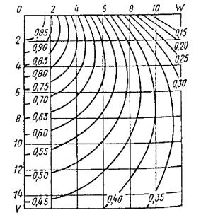где cωt и φωt - сцепление и угол внутреннего трения, отвечающие влажности ω грунта в заданный момент t; D и θ - разность и сумма главных напряжений в данной точке, определяемые по графикам прил. 6. Значения cωt и φωt можно устанавливать по графикам cω = f(ω), φω = f(ω), получаемым в результате испытаний грунта на сдвиг по методу плотности и влажности. При этом расчетная влажность грунта в момент t определяется по формуле ωt = ωнач - (ωнач - ωкон)U, (23) где ωнач и ωкон - начальная и конечная влажности; U - степень консолидации в момент t, устанавливаемая по решениям плоской задачи теории консолидации. Для определения U и расчета kстt следует использовать специальную программу для ЭВМ. В этом случае применяют следующие аналитические выражения для функций cωt = f(ω) и φωt = f(ω):