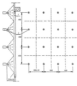 Примечание - В тех случаях, когда линия фактических замеров, расположенная и поле какого-либо класса (например, класса В), на локальном участке заходит в поле низшего класса (например, класса Г), испытываемому образцу присваивают номер низшего класса воздухопроницаемости В случае, если воздухопроницаемость образца превышает границу класса Д, буквенное обозначение класса образцу не присваивают Рисунок 4 - Пример построения диаграммы зависимости объемной воздухопроницаемости Q1, от перепада давления ΔP - наименование и юридический адрес организации-изготовителя испытываемой продукции; - наименование испытываемой продукции и нормативного документа, регламентирующего требования к ее качеству; - описание испытываемых образцов продукции (габаритные размеры образцов, схема открывания, конструкция притвора, число рядов уплотняющих прокладок и др.); - дату поступления образцов в испытательный центр (лабораторию); - номер регистрации образцов в испытательном центре (лаборатории); - дату испытаний образцов; - данные результатов испытаний по 3.4.2 - 3.4.7; - характеристики образцов по 3.4.6; - подписи руководителя испытательного центра (лаборатории) и испытателя, печать испытательного центра. 4 Метод определения водопроницаемостиМетод определения водопроницаемости заключается в установлении предела водонепроницаемости испытываемого образца в условиях имитации дождевого воздействия на него определенным количеством воды при заданных стационарных перепадах давления. 4.1 Испытательное оборудование и средства контроля4.1.1 Испытательное оборудование и средства контроля принимают по 3.1 со следующими дополнениями: - дождевальное устройство, позволяющее поддерживать во время испытания на всей поверхности образца сплошную водяную пленку. Пропускная способность дождевального устройства должна быть рассчитана из условия обеспечения подачи воды на 1 м2 контрольной поверхности образца (2+0,5) л в минуту; - термометр для измерения температуры воды с пределом измерения 0 - 50 °С с погрешностью ±1 °С; - регулятор расхода и счетчик воды с пропускной способностью более 3,0 м3/ч и порогом чувствительности не более 0,05 м3/ч. 4.1.2 Различные способы дождевания и описание применяемого для этого оборудования указаны в приложении А. 4.2 Порядок подготовки к испытанию4.2.1 Перед началом проведения испытании составляют программу испытаний, в которой должны быть отражены значения конечного контрольного давления и уточненный график перепадов давления. 4.2.2 Порядок подготовки к проведению испытания, включая отбор образцов, аналогичен приведенному в 3.2.1 со следующими дополнениями: - температура воды для дождевания должна быть от 8 до 20 °С; - форсунки дождевального устройства располагают в камере таким образом, чтобы наружная поверхность образца орошалась равномерно и полностью; - пропускная способность дождевального устройства должна быть отрегулирована согласно условиям 4.1.1. 4.2.3 Перед испытанием оконного блока проводят пробное включение дождевального устройства и убеждаются в правильности расположения форсунок, после этого образец протирают и производят предварительное воздействие на образец тремя импульсами заданного давления согласно 3.2.7 (рисунок 5). После снятия давления створчатые элементы образца пять раз открывают и закрывают, проверяя его исправность и г