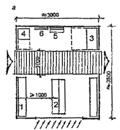 Рис. 14. Оборудование спален на 4 места для детей-инвалидов с различными нарушениями а - спальня для детей с нарушением слуха и зрения: 1 - тумба прикроватная; 2 - кровать детская; 3 - шкаф для одежды; 4 - стул; 5 - коврик б - спальня для детей с нарушением ОДА: 1 - кровать детская специальная; 2 - полка настенная; 3 - кресло-коляска; 4 - ходилки; 5 - поручни; 6 - тумбочка · Спальни для мальчиков и девочек проектируются раздельно, независимо от возраста учащихся. Спальни для мальчиков и девочек младшего школьного возраста входят в состав учебно-жилой ячейки одного класса. · Классы для занятий младших школьников должны оборудоваться одноместными столами. В классах для занятий детей с нарушением слуха, зрения, интеллекта расстояние между рядами столов должно быть не менее 600 мм, между столами - не менее 500 мм, ширина прохода между стеной и рядом столов - не менее 700 мм (рис. 15). · В классах необходимо предусматривать свободную зону для проведения игровых пауз во время урока. · Для детей с нарушением зрения на столах необходимо предусматривать индивидуальное рабочее освещение. · Для детей с нарушением слуха к столам должна подключаться сурдотехническая аппаратура. · В классе для занятий детей, пользующихся при ходьбе приспособлениями или креслами-колясками, должно предусматриваться жесткое крепление столов к полу. · Расстояние между столами и проходы должны быть не менее 850 мм. Для проезда и разворота кресла-коляски необходимо обеспечить проходы шириной не менее 1250 мм и разворотную площадку габаритом 1600 ´ 1600 мм. Жилая ячейка для старших школьников · В состав помещений жилой ячейки для старших школьников входят: гардероб-раздевальная, комната для сушки одежды, комната отдыха, спальни, комната для индивидуальных занятий, санитарный узел, комната для чистки и глажения одежды, комната воспитателя с кладовой личных вещей детей (рис. 13, б). · Рекомендуемый состав и площади помещений жилых ячеек для старших школьников даны в табл. 5. Таблица 5