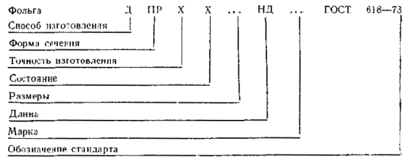 1.3. Фольгу изготовляют шириной от 10 до 1500 мм. Градация по ширине фольги должна быть 5 мм - при ширине до 500 мм и 10 мм - при ширине свыше 500 мм. Условные обозначения фольги проставляются по схеме: