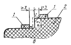 Примечание. Степень защиты может быть снижена для электрооборудования специального назначения, исключая вводные устройства. Например, для электрооборудования, которое постоянно подвергается осмотру и установлено в местах, не содержащих пыли. При этом степень защиты должна быть не ниже: 1Р23 - для электрооборудования группы I; 1Р20 - для электрооборудования группы II и стационарного (по ГОСТ 18311-80) электрооборудования группы I, установленного в специальных камерах. 1.2.2. Защита оболочек от внешних воздействий должна обеспечиваться средствами по ГОСТ 14254-80. (Измененная редакция, Изм. № 3). 1.3. Требования к контактным электрическим соединениям 1.3.1. Плотность тока в контактных соединениях не должна превышать 2,5 А/мм2. 1.3.2. Проводники, соединяемые с помощью пайки мягким припоем (с содержанием олова не менее 40%), должны быть соединены механически. 1.3.3. Контактные электрические соединения - по ГОСТ 10434-82. (Введен дополнительно, Изм. № 1). 1.4. Требования к электроизоляционным материалам 1.4.1. Электрооборудование группы I 1.4.1.1. Электроизоляционные материалы по ГОСТ 24719-81. 1.4.2. Электрооборудование группы II 1.4.2.1. Пути утечки и электрические зазоры должны соответствовать значениям, указанным в табл. 2. (Измененная редакция, Изм. № 1). 1.4.2.2. Пути утечки и электрические зазоры для частей, находящихся под разным напряжением, должны приниматься по напряжению большего значения. 1.4.2.3. Пути утечки и электрические зазоры между частями, находящимися под напряжением, и землей (корпусом) должны приниматься по линейному напряжению. 1.4.2.4. Электроизоляционные детали должны изготовляться из материалов, параметры трекингостойкости которых должны соответствовать указанным в табл. 3. (Измененная редакция, Изм. № 1). 1.4.2.5. Токоведущие части, которые покрыты лаком, эмалью, оксидированы или имеют аналогичную обработку, рассматриваются как неизолированные при определении путей утечки и электрических зазоров. 1.4.2.6. Длина пути утечки может быть увеличена за счет выполнения на изоляционных деталях ребер, пазов, уступов при условии: ширина и высота ребер составляют не менее 3 мм (черт. 1в приложения 1); пазы имеют ширину и глубину не менее 3 мм (черт. 2в приложения 1); уступы удалены от токоведущих частей на расстояние не менее 3 мм (черт 3в приложения 1). Примечание. Радиусы скруглений ребер, пазов, уступов должны быть не менее 0,5 мм. 1.4.2.7. Пути утечки, которые прерываются металлическими частями, не находящимися под напряжением, должны набираться по одному участку с однократным или двум участкам с 1,25-кратным значением, указанным в табл. 2. Примечание. Участки менее 3 мм не учитываются. 1.4.2.8. При определении путей утечки следует учитывать воздушные зазоры только более 3 мм. 1.4.2.9. Детали с ребрами, пластины, наложенные или размещенные впотай, должны быть соединены механически с несущей конструкцией таким образом, чтобы исключалось нарушение соединении.