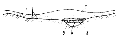 где hФ и lФ - соответственно толщина и коэффициент теплопроводности фундамента; НТП и lТП - толщина и коэффициент теплопроводности теплоизоляционной подушки. 4.2. При слабых и многолетнемерзлых грунтах в основании (сильно льдистых и пучинистых) могут быть применены круглые железобетонные трубы на однорядном свайном основании (рис. 8). При этой конструкции длинномерные звенья трубы (2- 3 м) опираются на фасонные насадки свай. Конструкция таких труб обеспечивает минимальное нарушение естественного мерзлотно-технологического режима водотоков. При аналогичных условиях и наледях несколько больших размеров в отдельных случаях может быть целесообразна свайно-щитовая труба конструкции Ленгипротранса (рис. 9). В глубоких логах и наледях большой толщины рациональна конструкция двухъярусной трубы, предложенная С.И. Гапеевым (рис. 10). Фундамент трубы состоит из железобетонных полых звеньев, заполняемых камнем и галькой. На фундаментные блоки в два яруса устанавливают прямоугольные блоки трубы и крылья оголовков. По высоте труба имеет два отверстия размеров 2´2 м. Между верхним и нижним ярусами в звеньях трубы делают отверстия размером 0,5´1,0 м. Если зимой образуется наледь толщиной 2,5-3,0 м и нижний ярус трубы окажется заполненным наледным льдом, это не опасно, так как остается свободной часть отверстия верхнего яруса. Когда начнется весенний сток, паводковые воды будут проходить через отверстия между ярусами трубы, и лед нижнего яруса будет подвергаться быстрому термоэрозионному разрушению. Рис. 9. Конструкция железобетонной свайно-щитовой трубы Ленгипротранса: 1 – насыпь; 2 - защитный слой цементного раствора; 3 – гидроизоляция; 4 - плита перекрытия; 5 - насадки (ригели); 6 - закладные плиты; 7 - сваи; 8 - верхняя граница многолетней мерзлоты; 9 - растительный мохо-торфяной слой; 10 - укрепление растительного слоя деревянным настилом, покрытым галькой и гравием; 11 - щебеночная подушка Рис. 10. Железобетонная двухъярусная труба для водотоков с наледями: 1 - железобетонные звенья трубы; 2 - отверстия в железобетонных звеньях размером 0,5´1,0 м; 3 - крылья оголовка; 4 - полые сборные звенья фундамента, заполняемые камнем и галькой Рис. 11. Железобетонная труба с фильтрующей насыпью: 1 - насыпь; 2 - дренирующий грунт; 3 - сборные звенья круглой трубы; 4 - фильтрующая насыпь 4.9. В районах с местными каменными материалами трубы на водотоках с наледями целесообразно строить в комплексе с фильтрующими насыпями. Нижнюю часть насыпи на высоту 1,0-1,5 м возводят из камня, над которой устанавливают трубу (рис. 11). Фильтрующая насыпь выполняет роль фундамента трубы и одновременно пропускает малые расходы. Труба, поднятая на высоту 1,0-1,5 м над дном лога, меньше подвержена затоплению наледью. Весной она обеспечивает пропуск максимального расхода, а затем большую часть года находится в сухом состоянии, что увеличивает ее долговечность. На суходолах с небольшими расходами и возможностью образования наледей малой толщины (не более 0,4 м) вместо труб допускается возводить фильтрующие насыпи (рис. 12). Рис. 12. Фильтрующая насыпь: 1 - грунт; 2 - каменная отсыпка 4.10. Отверстия искусственных сооружений на водотоках с наледями определяют расчетом на пропуск по поверхности наледи расчетного паводка. При гидравлическом расчете, отверстия не учитывают срезку и размыв, напорный и полунапорный режимы 
